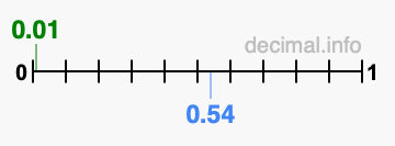 Below is our number line from 0 to 1, showing 0.01 colored in green and 0.54 colored in blue.