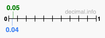 Below is our number line from 0 to 1, showing 0.05 colored in green and 0.04 colored in blue.
