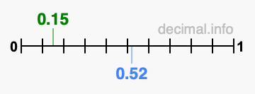 Below is our number line from 0 to 1, showing 0.15 colored in green and 0.52 colored in blue.