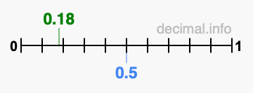 Below is our number line from 0 to 1, showing 0.18 colored in green and 0.5 colored in blue.