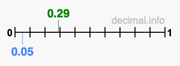 Below is our number line from 0 to 1, showing 0.29 colored in green and 0.05 colored in blue.