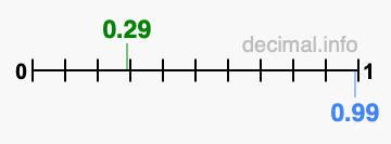 Below is our number line from 0 to 1, showing 0.29 colored in green and 0.99 colored in blue.