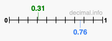 You have come to the right place if you want to know if 0.31 is greater than 0.76. We think that the easiest way to determine which is greater, 0.31 or 0.76, is to plot both values on a number line.