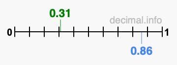 You have come to the right place if you want to know if 0.31 is greater than 0.86. We think that the easiest way to determine which is greater, 0.31 or 0.86, is to plot both values on a number line.