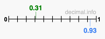 You have come to the right place if you want to know if 0.31 is greater than 0.93. We think that the easiest way to determine which is greater, 0.31 or 0.93, is to plot both values on a number line.
