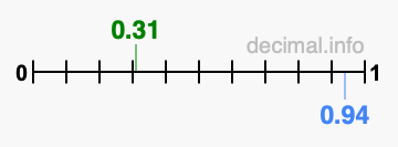 You have come to the right place if you want to know if 0.31 is greater than 0.94. We think that the easiest way to determine which is greater, 0.31 or 0.94, is to plot both values on a number line.