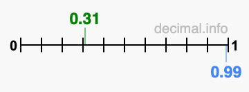 You have come to the right place if you want to know if 0.31 is greater than 0.99. We think that the easiest way to determine which is greater, 0.31 or 0.99, is to plot both values on a number line.