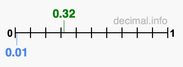 Below is our number line from 0 to 1, showing 0.32 colored in green and 0.01 colored in blue.