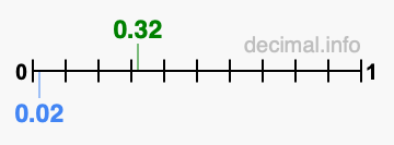 You have come to the right place if you want to know if 0.32 is greater than 0.02. We think that the easiest way to determine which is greater, 0.32 or 0.02, is to plot both values on a number line.
