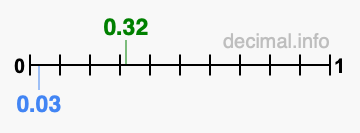 Below is our number line from 0 to 1, showing 0.32 colored in green and 0.03 colored in blue.