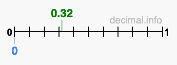 Below is our number line from 0 to 1, showing 0.32 colored in green and 0 colored in blue.