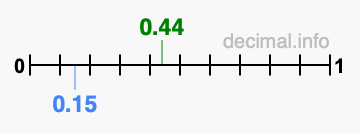 Below is our number line from 0 to 1, showing 0.44 colored in green and 0.15 colored in blue.
