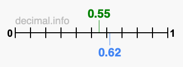 You have come to the right place if you want to know if 0.55 is greater than 0.62. We think that the easiest way to determine which is greater, 0.55 or 0.62, is to plot both values on a number line.
