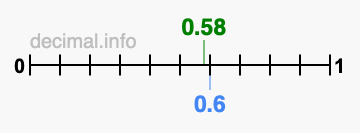 Below is our number line from 0 to 1, showing 0.58 colored in green and 0.6 colored in blue.