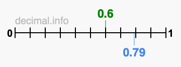 Below is our number line from 0 to 1, showing 0.6 colored in green and 0.79 colored in blue.