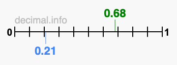 Below is our number line from 0 to 1, showing 0.68 colored in green and 0.21 colored in blue.