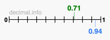 You have come to the right place if you want to know if 0.71 is greater than 0.94. We think that the easiest way to determine which is greater, 0.71 or 0.94, is to plot both values on a number line.