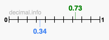 You have come to the right place if you want to know if 0.73 is greater than 0.34. We think that the easiest way to determine which is greater, 0.73 or 0.34, is to plot both values on a number line.