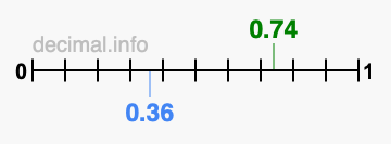 You have come to the right place if you want to know if 0.74 is greater than 0.36. We think that the easiest way to determine which is greater, 0.74 or 0.36, is to plot both values on a number line.