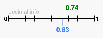 You have come to the right place if you want to know if 0.74 is greater than 0.63. We think that the easiest way to determine which is greater, 0.74 or 0.63, is to plot both values on a number line.