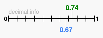 You have come to the right place if you want to know if 0.74 is greater than 0.67. We think that the easiest way to determine which is greater, 0.74 or 0.67, is to plot both values on a number line.