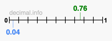 Below is our number line from 0 to 1, showing 0.76 colored in green and 0.04 colored in blue.