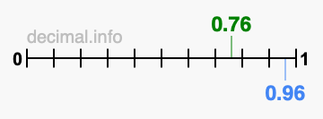 Below is our number line from 0 to 1, showing 0.76 colored in green and 0.96 colored in blue.