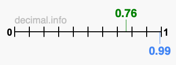 You have come to the right place if you want to know if 0.76 is greater than 0.99. We think that the easiest way to determine which is greater, 0.76 or 0.99, is to plot both values on a number line.
