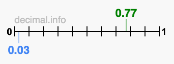 Below is our number line from 0 to 1, showing 0.77 colored in green and 0.03 colored in blue.