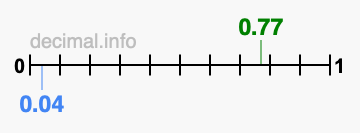 Below is our number line from 0 to 1, showing 0.77 colored in green and 0.04 colored in blue.