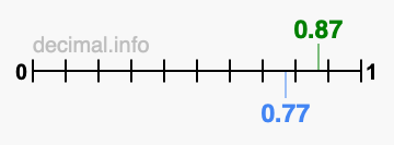 You have come to the right place if you want to know if 0.87 is greater than 0.77. We think that the easiest way to determine which is greater, 0.87 or 0.77, is to plot both values on a number line.