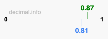 You have come to the right place if you want to know if 0.87 is greater than 0.81. We think that the easiest way to determine which is greater, 0.87 or 0.81, is to plot both values on a number line.
