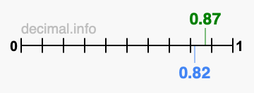 You have come to the right place if you want to know if 0.87 is greater than 0.82. We think that the easiest way to determine which is greater, 0.87 or 0.82, is to plot both values on a number line.