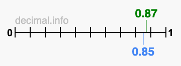 You have come to the right place if you want to know if 0.87 is greater than 0.85. We think that the easiest way to determine which is greater, 0.87 or 0.85, is to plot both values on a number line.