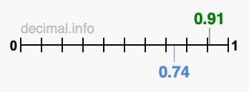 You have come to the right place if you want to know if 0.91 is greater than 0.74. We think that the easiest way to determine which is greater, 0.91 or 0.74, is to plot both values on a number line.