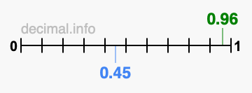 Below is our number line from 0 to 1, showing 0.96 colored in green and 0.45 colored in blue.