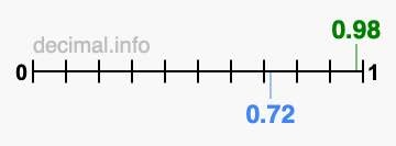 Below is our number line from 0 to 1, showing 0.98 colored in green and 0.72 colored in blue.