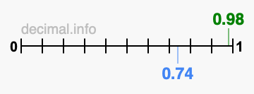 Below is our number line from 0 to 1, showing 0.98 colored in green and 0.74 colored in blue.