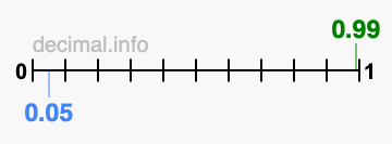 Below is our number line from 0 to 1, showing 0.99 colored in green and 0.05 colored in blue.
